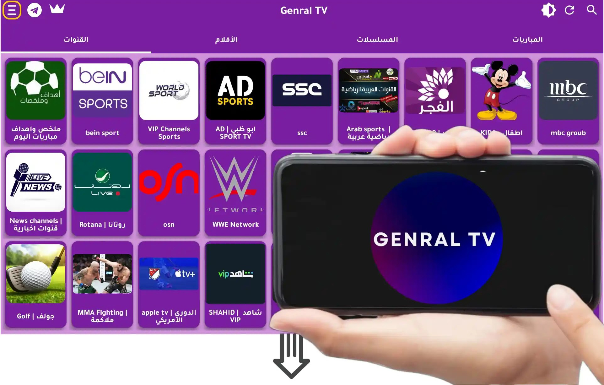 في هذا المقال الشامل، سنتحدث عن تطبيق General TV او بما يسمى ايضا بالاسم الجديد في التحديث الاخير Genral TV Pro، وهو أحد أفضل التطبيقات التي تسمح لك بمشاهدة القنوات التلفزيونية المباشرة، المباريات الرياضية، الأفلام، والمسلسلات بكل سهولة. يأتي هذا التطبيق مع كود تفعيل يتيح لك الوصول إلى مئات القنوات والباقات المتنوعة، بالإضافة إلى محتويات حصرية على الاندرويد.
